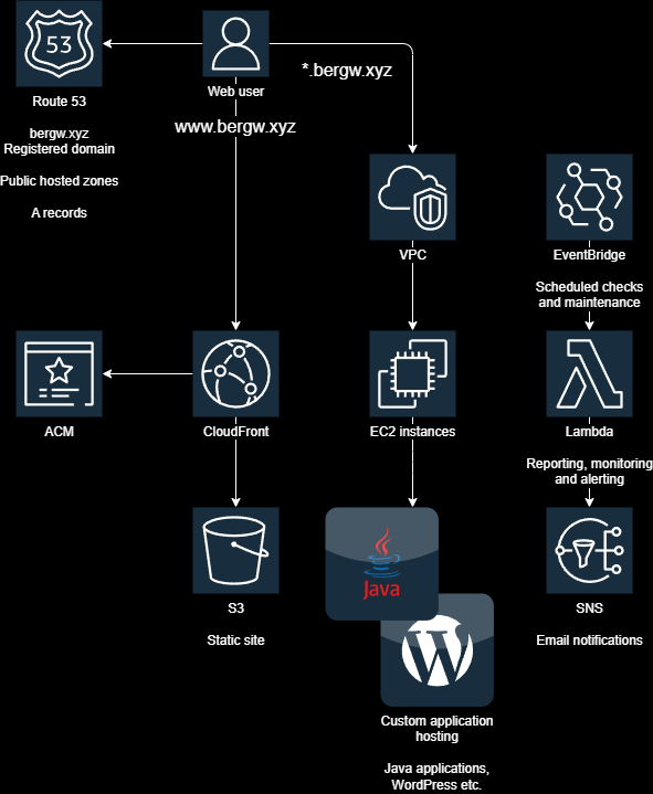 bergw.xyz is entirely cloud-native and the infrastructure for the entire system, including auxiliary systems like monitoring, runs in a single AWS account. These AWS services include: